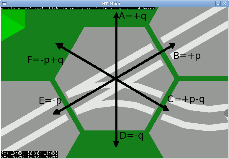 The 6 directions of travel are known as HexDir_A to HexDir_F in the code, and these can be expressed as these (p,q) vectors :-