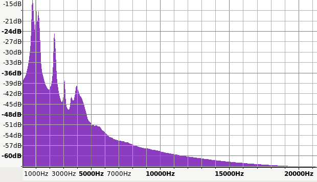 The envelope is relatively easy to copy, but the frequency distribution is difficult. I simply take 3 of the largest frequency peaks (870Hz, 2422Hz and 3936Hz) and program the tone generators with them. Their volumes are then set from the envelope, but in the ratio of the peak sizes. The result is recognisable as a kind of a bell like noise. Not perfect, but its about as good as I am going to get.