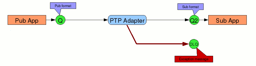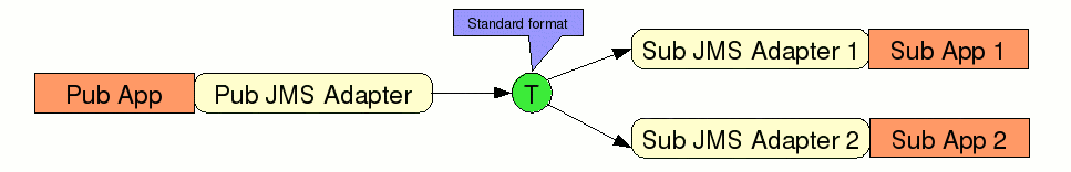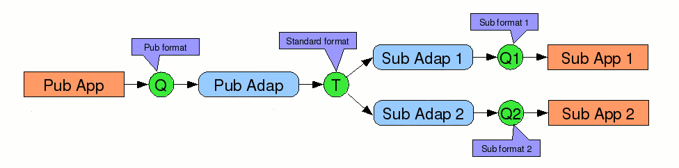 Sometimes enterprises implement a decoupled model with pub-adapters and sub-adapters, and a standard intermediate data representation :-