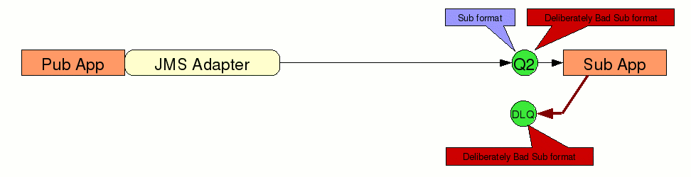 In the sample, the client application would normally use application message formats in application specific queues, and some adapter would convert between this and a standard services message formats in standard service specific queues. Here, we configure the application to use JMS Adapter to translate application messages to standard messages, and put them in standard queues, and vice versa :-